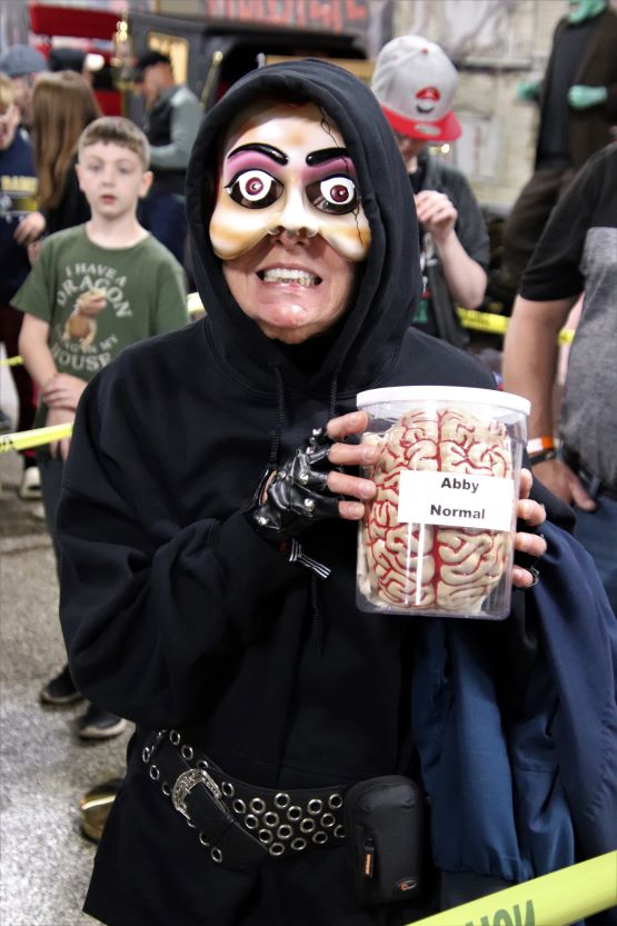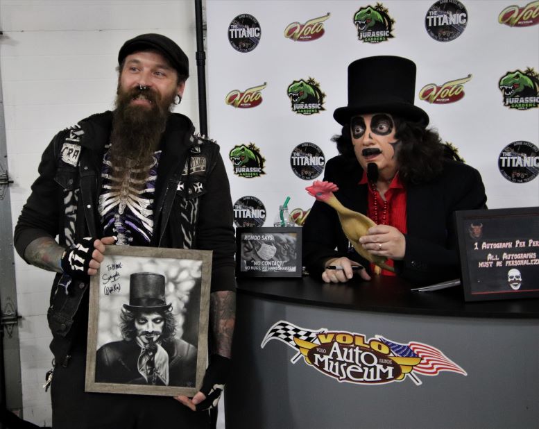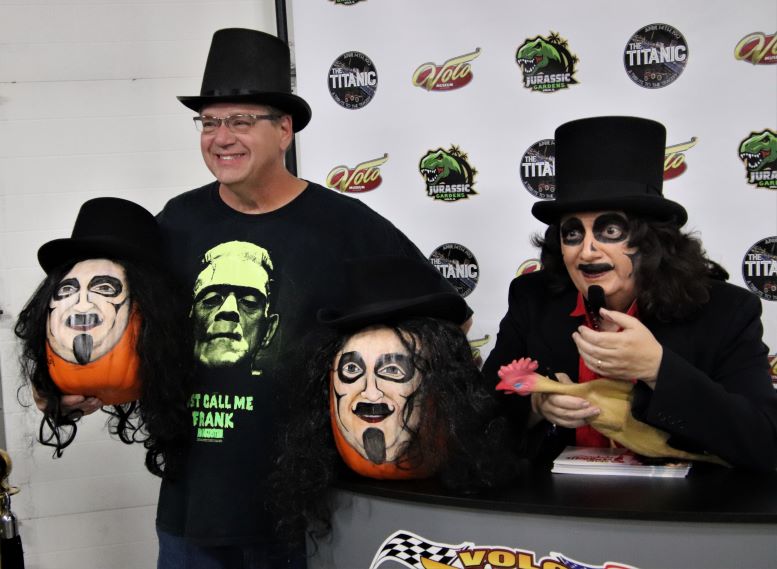 Unlike last year, I was physically and mentally prepared for Svengoolie’s annual October appearance at the Volo Auto Museum. This involved getting plenty of exercise during the week leading up to it, adequate sleep the night before, and a big bowl of Wheaties the morning of. For those unfamiliar, this is the only Svengoolie appearance that consistently puts him into overtime and I knew I’d be on my feet selling Svengoolie t-shirts, hats, and buttons for the better part of four hours. When I met up with MeTV’s national horror host and his executive producer, Jim Roche, they were as well-rested and ready to go as I was. Svengoolie even danced a sort of jig for Volo’s Marketing Director, Jim Wojdyla, for a video he was working on. It was soon time for him to take on the crowd…