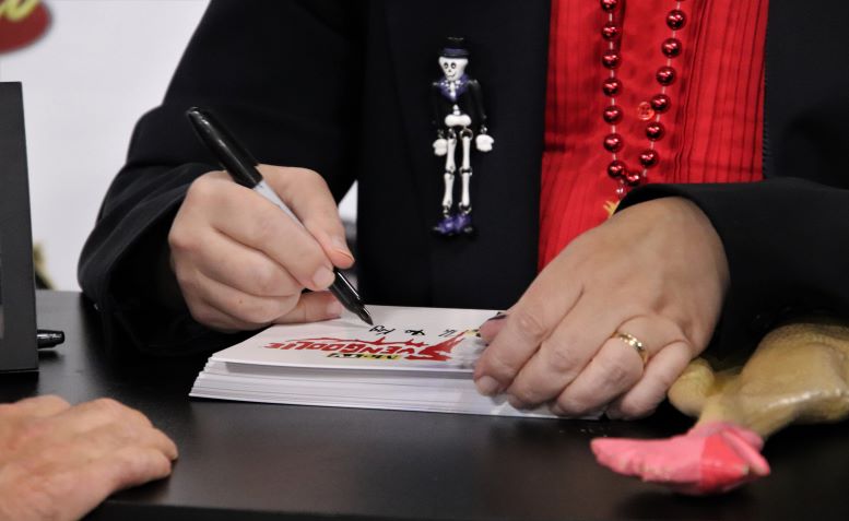 The same goes for a clever couple who had him sign their map of Berwyn. I wanted to get a shot of them holding it up but Sven’s customers dictated otherwise. It turns out Volo patrons have deep pockets and by the end of the first hour, we ran out of his $10 button sets. Attention future me reading this post – tell Jim to pack a LOT more buttons for 2024!