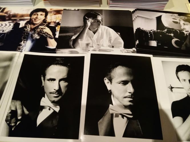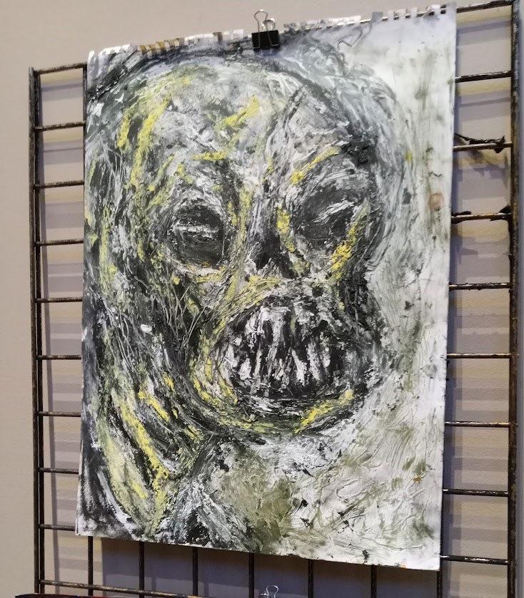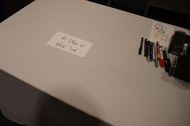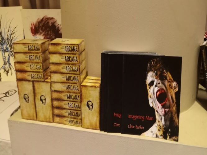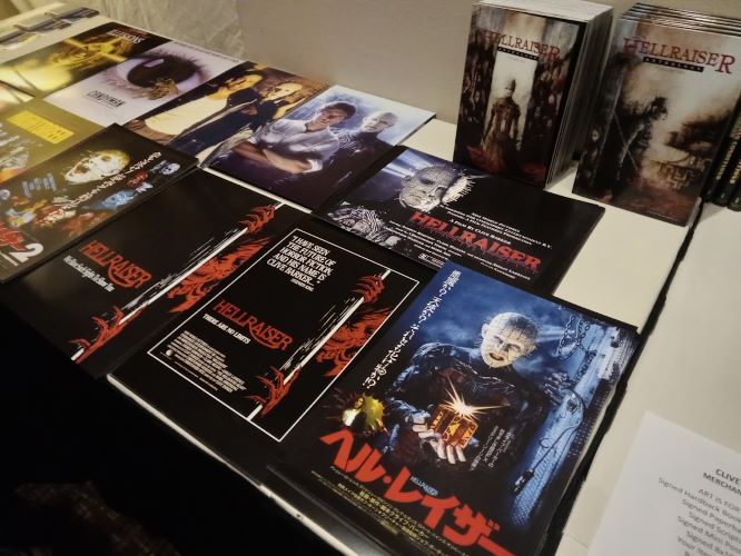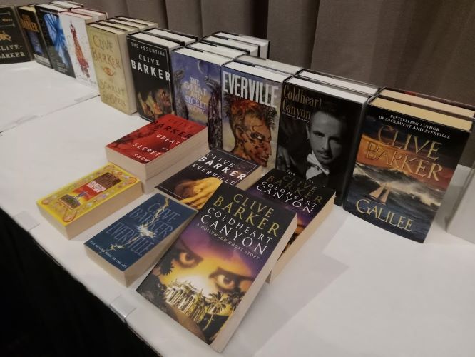 Before entering the ballroom, we were told (due to Barker’s difficulty speaking) to just say “Hello” and avoid engaging in conversation. Everyone was also required to wear a mask in his presence which they handed out; though having been informed ahead of time, I brought my own. Once inside, there was a lot to take in. Barker’s original paintings were for sale and adorned the wall while several tables boasted collector editions of his books and much more.