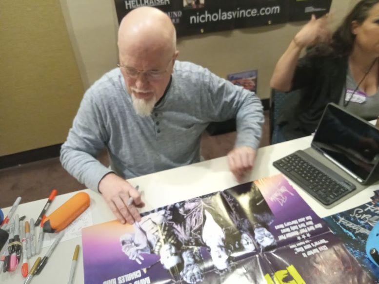 After it was over, I headed back to the main hall to obtain the remaining autographs for my poster. I started with Doug Bradley who in addition to his iconic role as Pinhead in Barker’s Hellraiser films, also played Dirk Lylesberg in Nightbreed – although his dialogue was dubbed over by another actor for its theatrical cut. Like Barker, Bradley has had his share of health issues but looked fantastic and enjoyed interacting with fans.