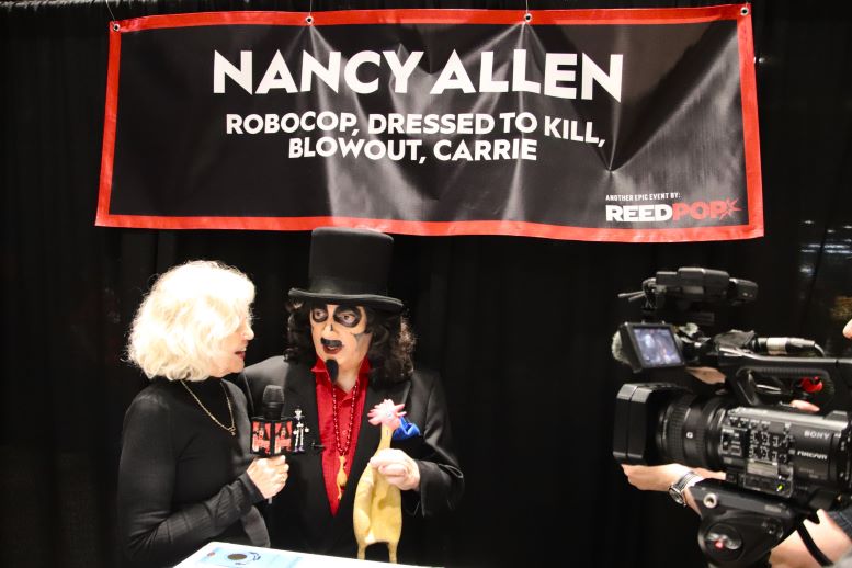 After leaving Lawler, we headed over to Nancy Allen. The interview started well until a man’s head poked through the curtain between Allen and the booth on her left (the same spot Svengoolie had been signing at the day before) and began yelling for her attention. At first, Svengoolie and Ms Allen were oblivious until after the interloper (who wasn’t in the least bit squeamish about interrupting) persisted.