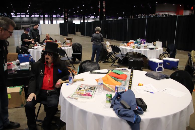 Soon, a golf cart arrived to whisk Svengoolie to his photo op while I was tasked with “preserving horror host hydration,” a.k.a. guarding his water bottle. Before leaving, Svengoolie kept joking with me, saying, “You mustn’t allow anyone to touch this water bottle! This is a VERY important job.” I admit, I was tempted to hide it and then cry, “But I only turned my back for a minute!” when he returned, but thought better of it.