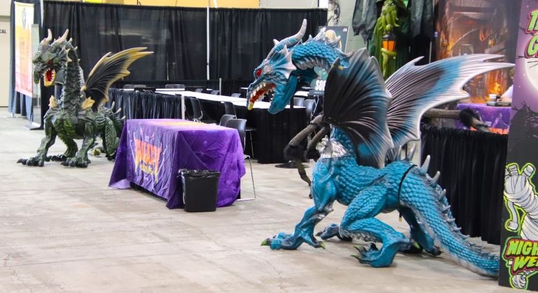 For a horror convention, the space was immense. It was loaded with dealers, and I had trouble deciding where to look first. On the left was an arena where folks dressed as slashers would wrestle one another. There was also a main stage with rows and rows of chairs for celebrity guest panels. Across from that was a gaming area and numerous monster statues for photo opportunities.
