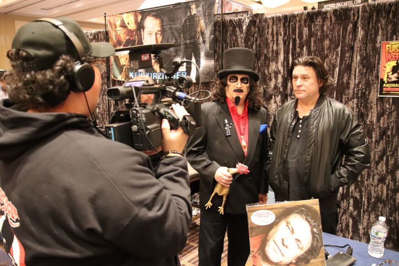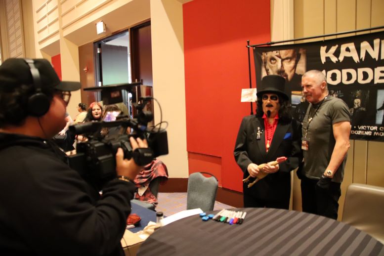 The Svengoolie crew arrived with the same folks as Friday with the exception of a new camera person, Andres Aurelio. Once again, everyone immediately split up to attend to their tasks, Don and I escorting Svengoolie to Nick Digilio’s podcast show. Since the panel was already underway, Nick began introducing Sven as soon as he saw him. He was joined by his Nick D Podcast co-host, Esmeralda Leon. She used Svengoolie’s scheduled airing of The Black Scorpion (1957) that night as an opportunity to tell a hilarious story of her visiting Mexico and encountering a real one (albeit normal-sized).