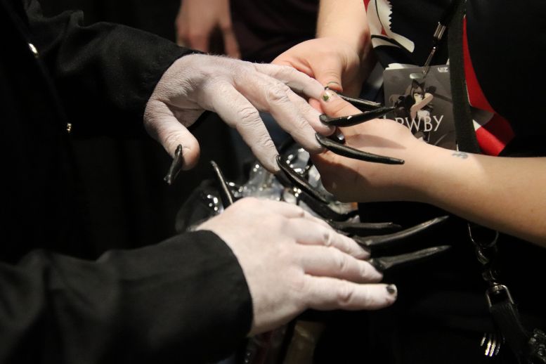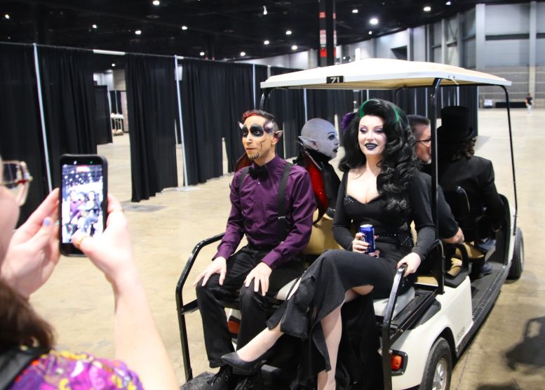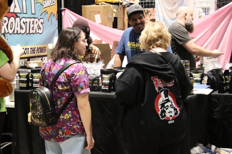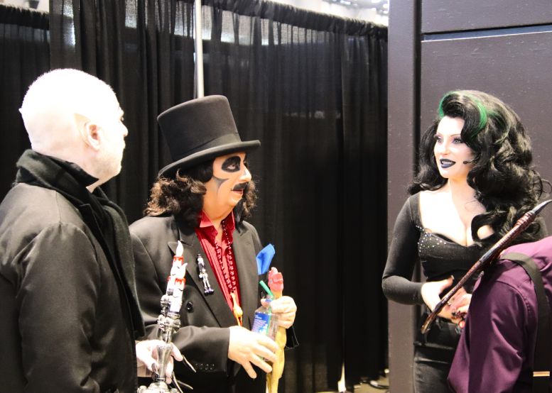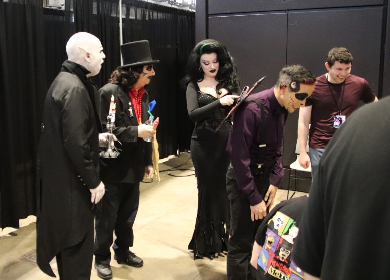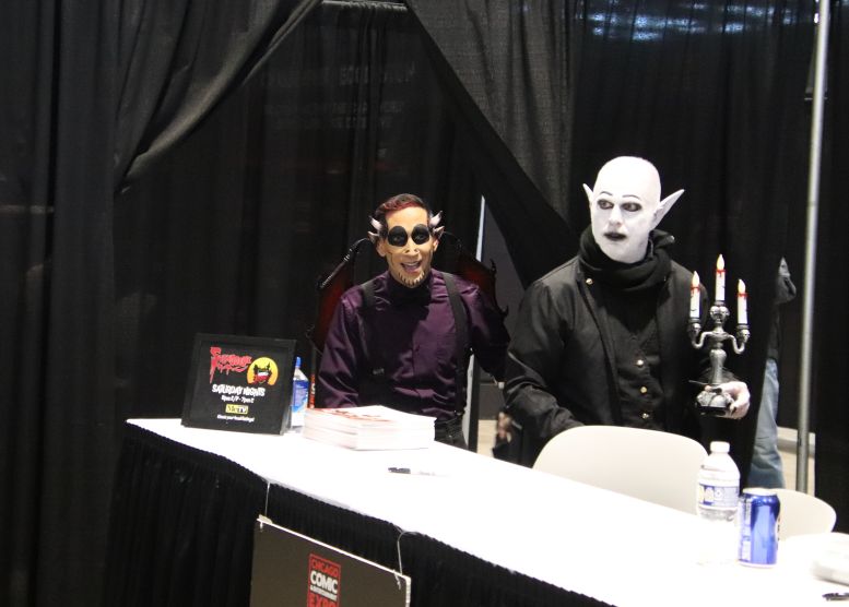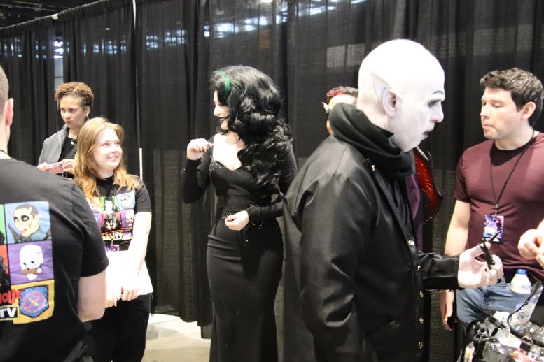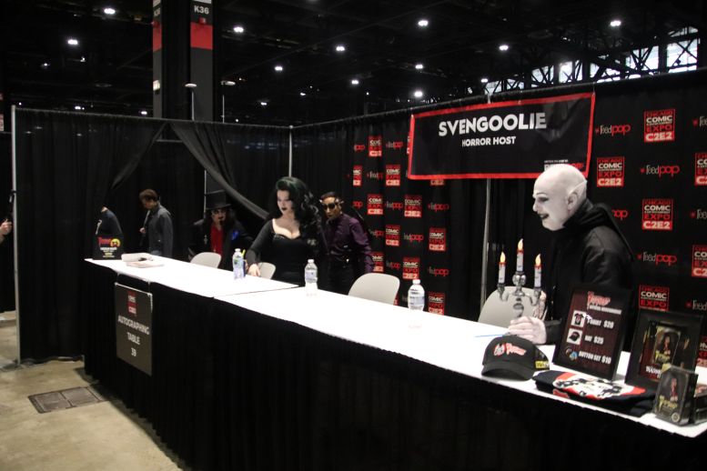 Instead of Booth 41, Svengoolie and Squad occupied the two spots next to it, 39 and 40. Once again, the crew was behind the curtain preparing their equipment and merchandise, but with a few changes to their lineup. Instead of the merchandise guys who sold Svengoolie shirts, hats, and trading cards yesterday, Maddie Kern from props would handle today’s sales. The Squad was also behind the curtain, preparing with Sven. This was the first time I’d formally meet Sarah Palmer (Gwengoolie) and Scott (Imp). I’d already met Bill Leff (Nostalgiaferatoo) at the TV station a while back (when I got to play the hand at the door, covered HERE). I had a lot of fun interacting with them, and you could tell they were excited to be there with a genuine desire not to disappoint the fans.