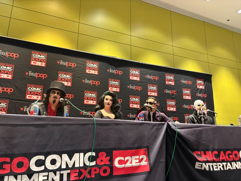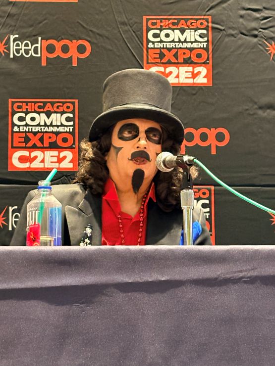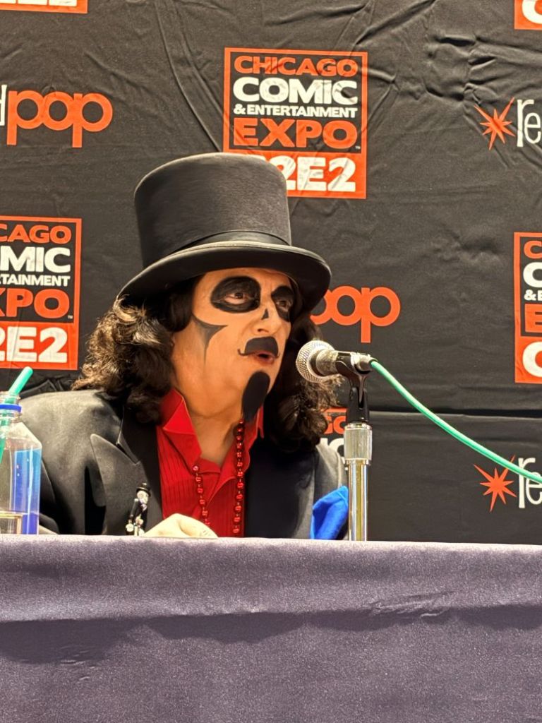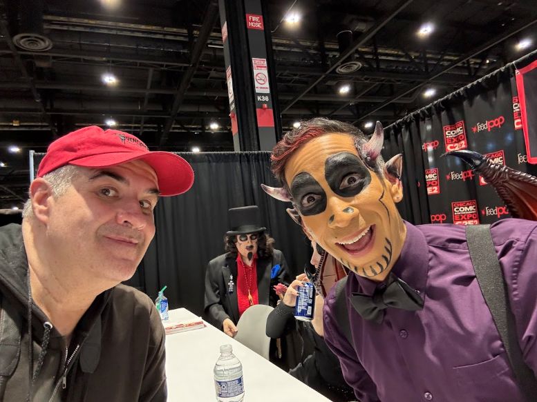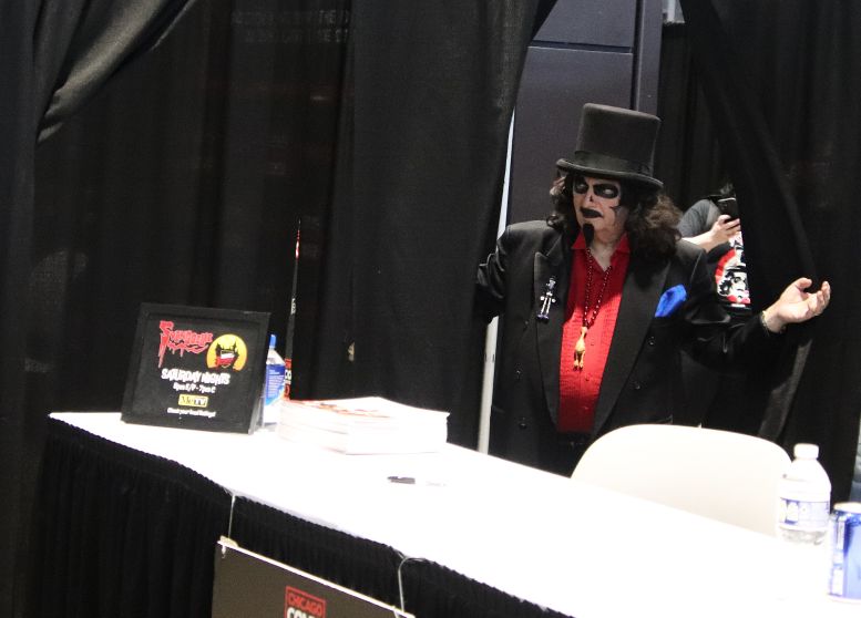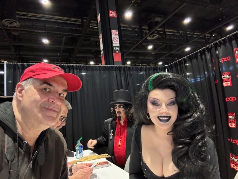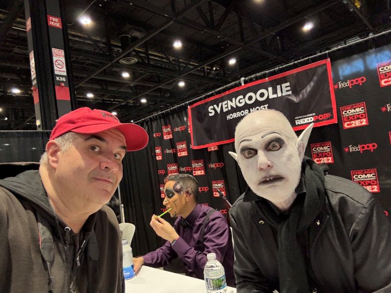 I met back up with the crew in the Green Room and was having a nice chat with the sound specialist, Martin Stebbing (he worked in the music industry back in his native UK, and we discussed our mutual admiration for David Bowie) when actor Martin Sheen walked in. Looking at the cast members, he approached us and, sounding every bit like his famous character President Jed Bartlett from The West Wing, asked, “What is this, some kind of horror show?” We all laughed and, after explaining who we were, shook his hand. I told him he was my favorite President and, as a huge fan of that TV series, this was one of the highlights of C2E2 for me. It was also hilarious watching him have a conversation with Nostalgiaferatoo in full makeup while he told Mr. Sheen his alter ego, Bill Leff, had acted with his son, Charlie Sheen, in Major League (1989) and Major League II (1994). I should note that Svengoolie and Jim Roche were unfortunately absent from this experience.