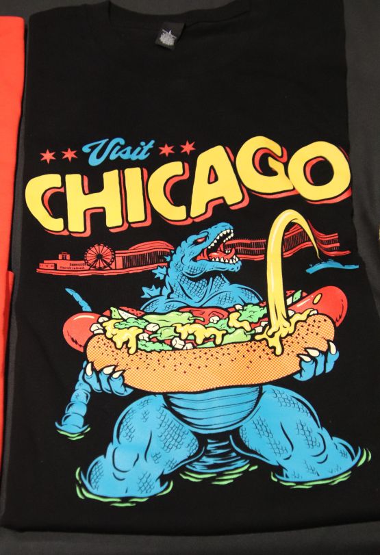 With the extra time, I stopped over at booth 883, occupied by the folks from Harebrained Design. Nanette Keir had purchased a cool Godzilla shirt featuring the King of Monsters and a Chicago-style hot dog. The night before, my son, Luke (huge Godzilla fan), surprised me by picking me up dinner and having it ready for me when I got home. He knew I’d be wiped, and it was a very thoughtful thing for him to do. Needless to say, I thought I’d show my appreciation by getting him this shirt, which he loved.