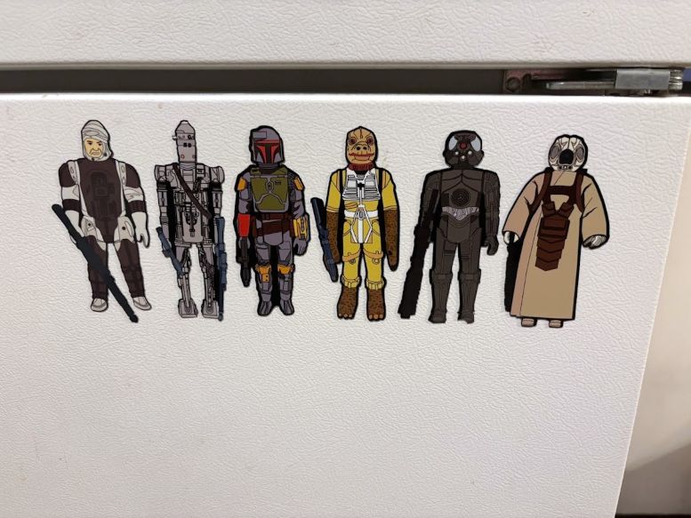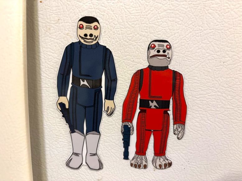 The only other items I purchased at C2E2 were on Sunday, where I found a booth selling magnets depicting the Kenner STAR WARS action figures I grew up with. They were selling eight magnets for $20, so I snatched up the six bounty hunters (Dengar, IG-88, Boba Fett, Bossk, 4-LOM, and Zuckuss) from my favorite of those films, The Empire Strikes Back (1980), along with the red and blue Snaggletooth (if you know, you know).