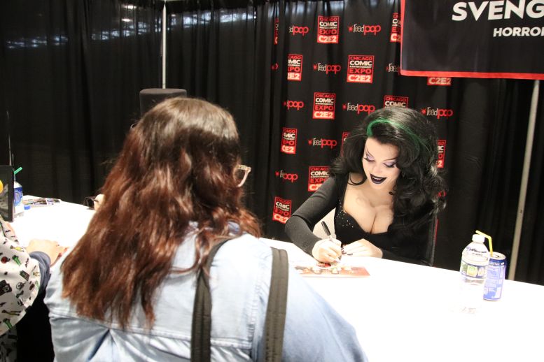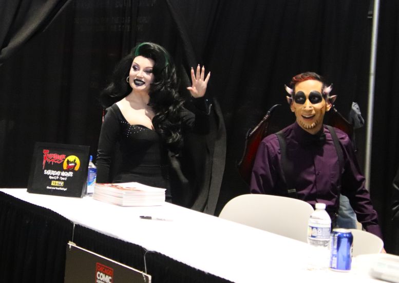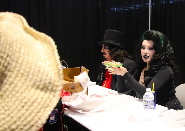 The order of signing was Svengoolie, Gwengoolie, Imp, and Nostalgiaferatoo. All of them took time with the fans and asked all kinds of questions about where everyone was from and how long they’d watched Svengoolie. Gwengoolie was extremely popular, as I assumed she would be. Not just with tongue-tied male fans, but even women seemed very responsive to her; a rare gift shared by the great Elvira, Mistress of the Dark, as well.