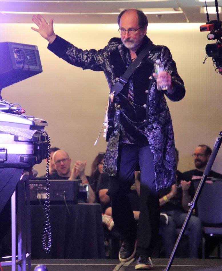 Though the Saturday night Alan Howarth concert at Flashback Weekend was slated for 8:30 p.m., I left my room a half hour earlier in case there was a line. And what a line it would be! As soon as saw all the fans weaving the circumference of the hotel’s basement I was painfully aware I should have left an hour earlier instead. The concert took place in the same room as the costume contest (see last post) and I heard people in line saying that many had been turned away on account of it being too full. Whether that was true or not, I have no way of knowing. What I can tell you is that once the idea entered my mind, I was thoroughly convinced I was never going to get in. This, coupled with how achy and tired I was from a full day of conventioneering had me damn close to giving up and returning to my room. Somehow, I successfully ignored the voice in my head, and once the doors opened around 9 p.m. the line quickly got moving. I was surprised, I actually found a seat, albeit at the far right of the stage. Although it meant craning my neck to see the video screen, I didn’t mind as I’d have an unobstructed view of Howarth – ideal for taking pictures.